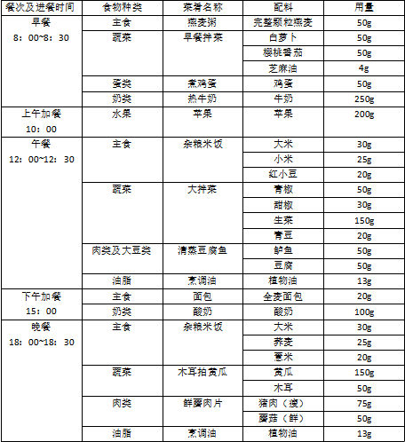 可以看出,在食物方面,食譜符合食物種類多樣的要求。在營(yíng)養(yǎng)素方面,食譜的營(yíng)養(yǎng)素符合指南要求,供能比為蛋白質(zhì)15%~20%、脂肪25%~35%、碳水化合物45%~60%。